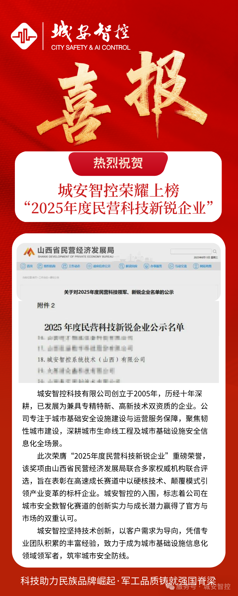 喜报!城安智控荣登“2025年度民营科技新锐企业”榜单
